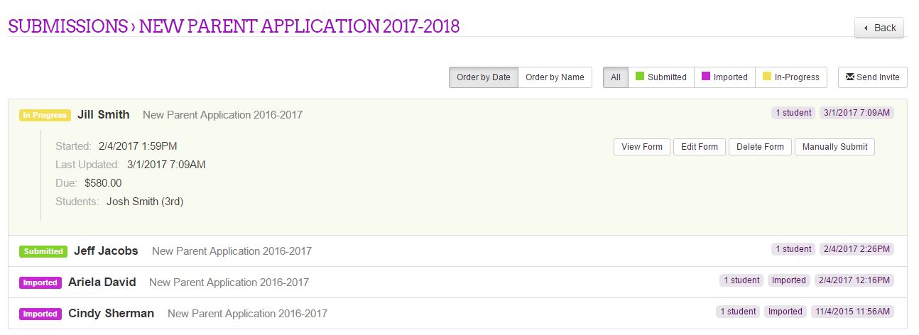 All submissions come into the form's submissions inbox, visible to form administrators. From here, you'll be able to see each forms status, for example, "Started", "In-Progress", "Submitted", or "Imported." Additionally, forms can be viewed, edited, manually submitted, printed, and imported.